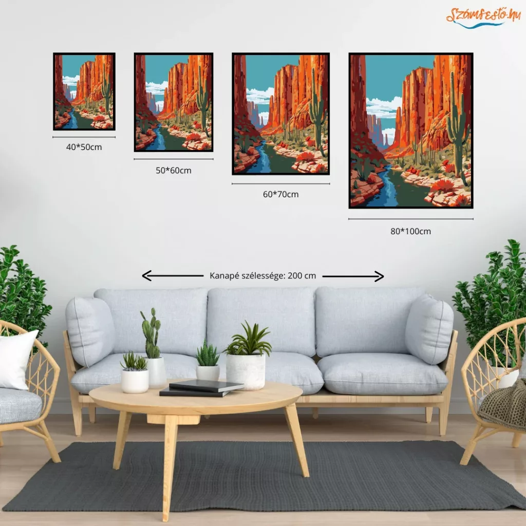 A képen magas, narancsos sziklafalak között kanyargó folyó látható, a parton több kaktusszal és pirosan virágzó növényekkel. A távoli sziklatornyok és a tiszta égbolt tágas, vadregényes hangulatot adnak. Meleg földszínek és friss kék víz teszik igazán látványossá a tájat. Ez a számfestő készlet tökéletes választás, ha egyedi dekorációval tennéd szebbé otthonodat, vagy ha különleges ajándékot keresel. A csomagban minden megtalálható, amire a festéshez szükséged van.