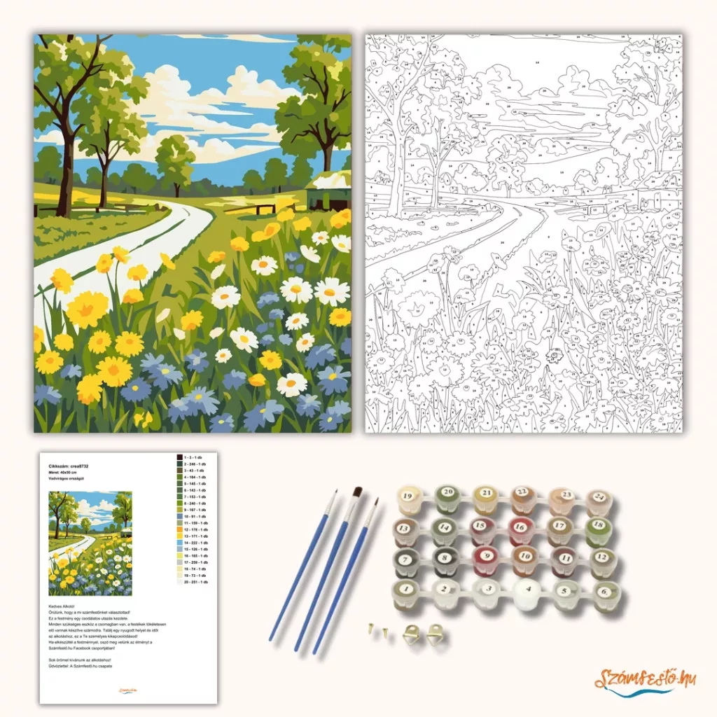 A képen egy kanyargó országút vezet a tavaszi mezők között, zöld fák és bokrok kíséretében. Az előtérben vadvirágok nyílnak: margaréták és sárga, valamint apró kék virágok. A világos ég és a puha felhők nyugodt, friss hangulatot adnak a tájnak. Engedd szabadjára a kreativitásodat, és alkoss egy különleges műalkotást, amely otthonod dísze lehet de egyedi ajándékként is kiváló. A számfestő készletben minden szükséges eszközt megtalálsz a tökéletes végeredményhez.