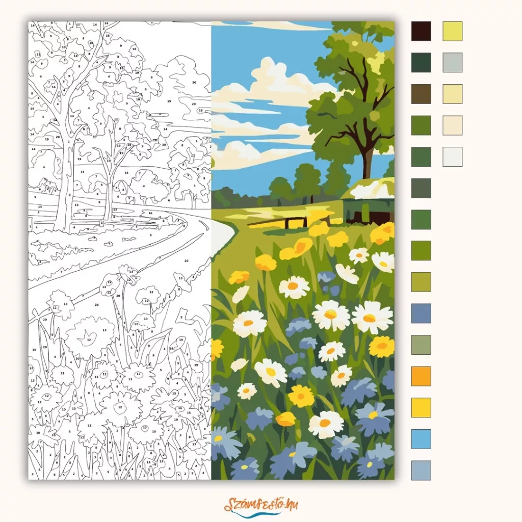 A képen egy kanyargó országút vezet a tavaszi mezők között, zöld fák és bokrok kíséretében. Az előtérben vadvirágok nyílnak: margaréták és sárga, valamint apró kék virágok. A világos ég és a puha felhők nyugodt, friss hangulatot adnak a tájnak. Varázsolj egyedi hangulatot otthonodba ezzel a gyönyörű számfestő készlettel, amely tökéletes ajándék is lehet szeretteid számára. A csomag mindent tartalmaz, amire szükséged van ahhoz, hogy saját kezűleg alkoss egy lenyűgöző festményt.