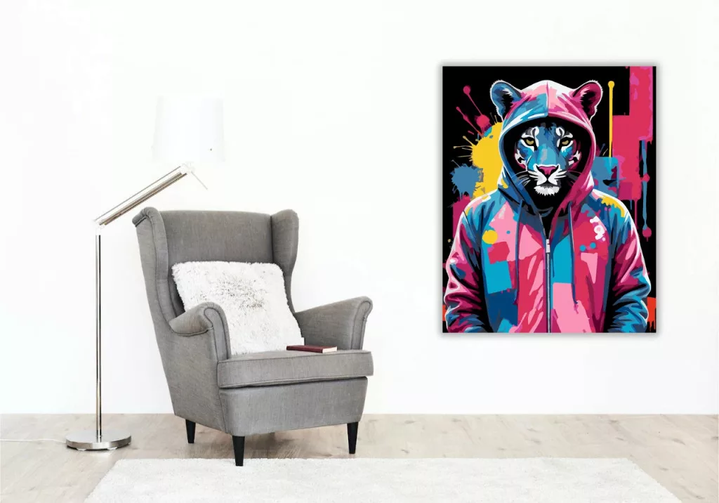 A képen egy párduc látható kapucnis pulóverben, szemből nézve. A háttérben festékfröccsenések és lecsorgó festékcsíkok jelennek meg. Az élénk, kontrasztos színek vagány, városi hangulatot adnak a képnek. Varázsolj egyedi hangulatot otthonodba ezzel a gyönyörű számfestő készlettel, amely tökéletes ajándék is lehet szeretteid számára. A csomag mindent tartalmaz, amire szükséged van ahhoz, hogy saját kezűleg alkoss egy lenyűgöző festményt.