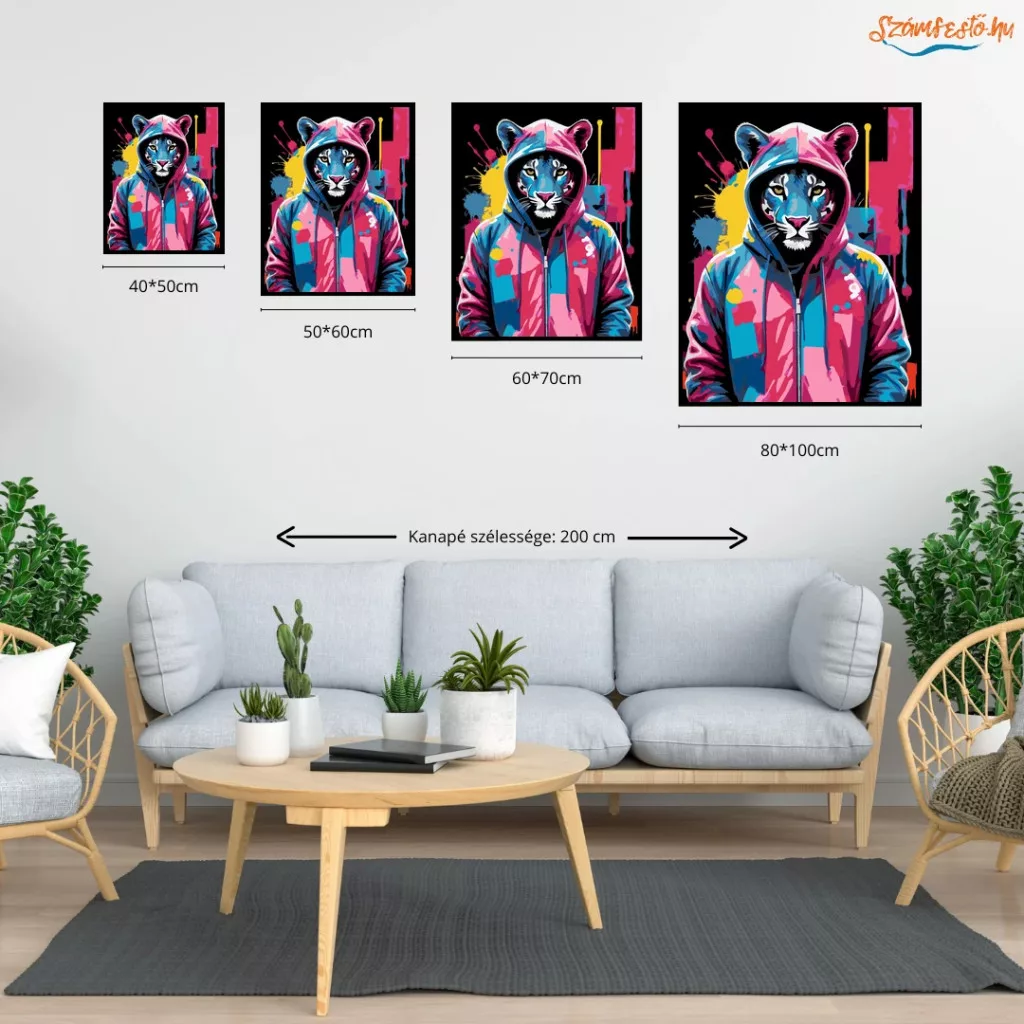 A képen egy párduc látható kapucnis pulóverben, szemből nézve. A háttérben festékfröccsenések és lecsorgó festékcsíkok jelennek meg. Az élénk, kontrasztos színek vagány, városi hangulatot adnak a képnek. Legyen a lakásod dísze vagy egy kedves meglepetés valaki számára – ez a számfestő készlet tökéletes választás mindkettőre. A készletben mindent megtalálsz, amivel lépésről lépésre megalkotható ez a gyönyörű festmény.