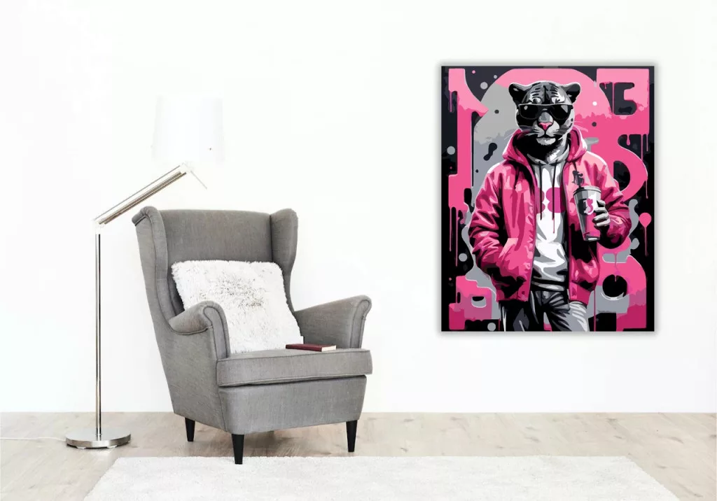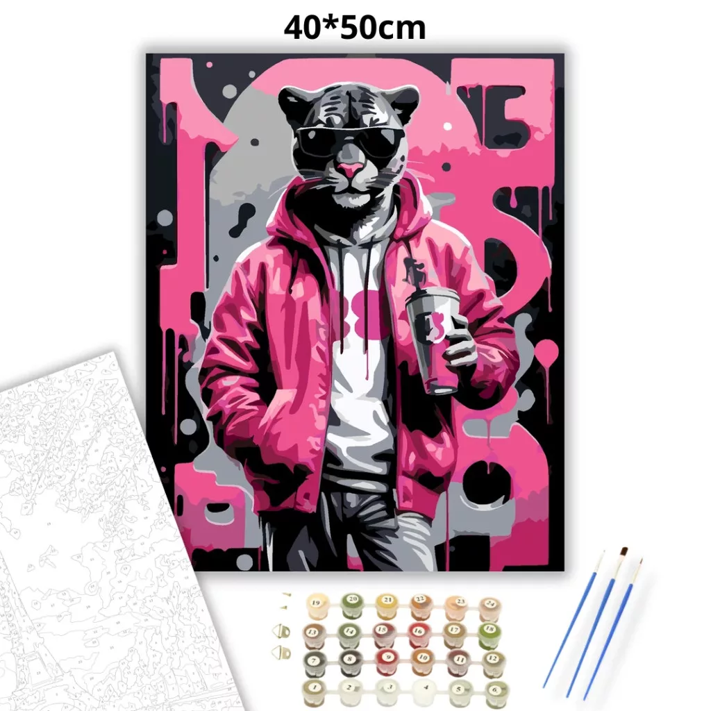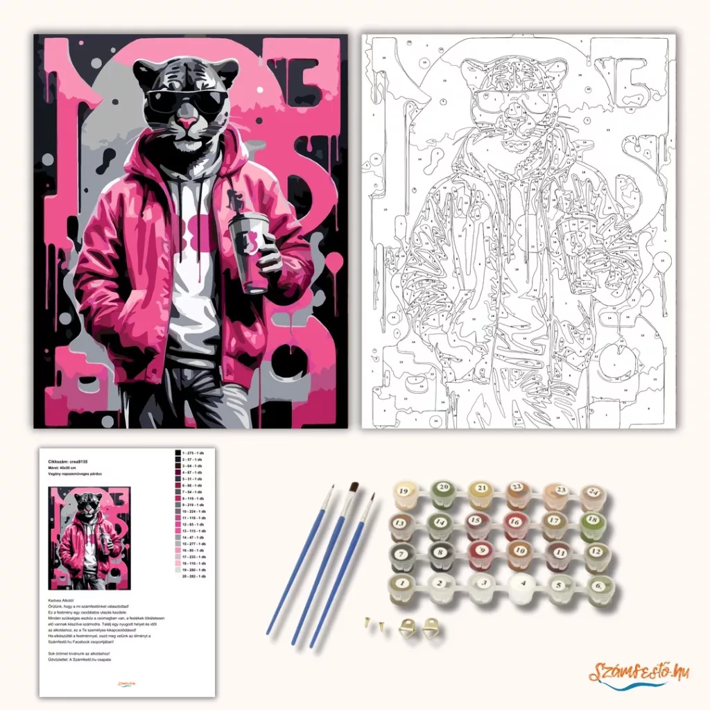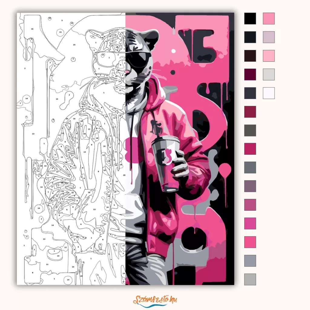 A képen egy napszemüveges párduc látható, kapucnis felsőben és dzsekiben. A kezében egy fedeles poharat tart, a háttérben pedig csöpögő festékhatás és nagy betűk jelennek meg. A fekete, szürke és élénk rózsaszín árnyalatok vagány, városi hangulatot adnak. Díszítsd otthonodat saját kézzel készített műalkotással, vagy ajándékozd meg szeretteidet egy igazán különleges élménnyel! A számfestő készletben minden szükséges eszköz megtalálható a festmény elkészítéséhez.