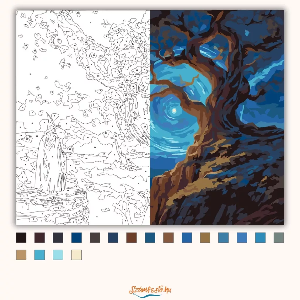 A képen egy magányos alak áll egy sziklaszirt peremén, és egy örvénylő, csillagfényes kapu ragyog az éjszakai ég alatt. A háttérben egy ősi, csavarodó fa magasodik, a hold és a csillagok pedig titokzatos, mesés hangulatot adnak a jelenetnek. Engedd szabadjára a kreativitásodat, és alkoss egy különleges műalkotást, amely otthonod dísze lehet de egyedi ajándékként is kiváló. A számfestő készletben minden szükséges eszközt megtalálsz a tökéletes végeredményhez.