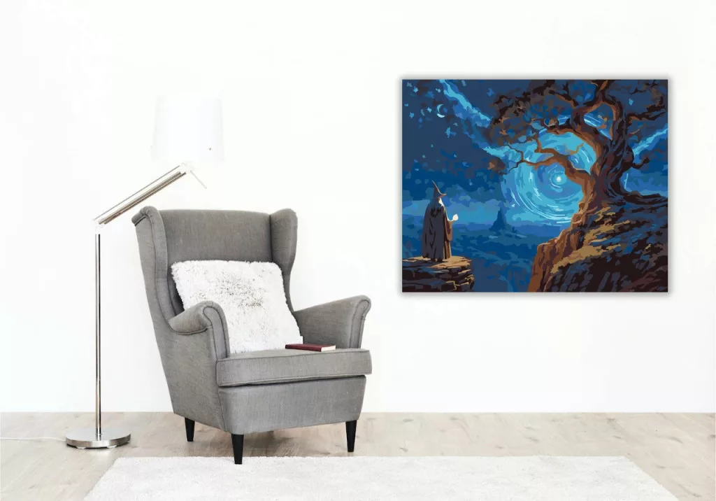 A képen egy magányos alak áll egy sziklaszirt peremén, és egy örvénylő, csillagfényes kapu ragyog az éjszakai ég alatt. A háttérben egy ősi, csavarodó fa magasodik, a hold és a csillagok pedig titokzatos, mesés hangulatot adnak a jelenetnek. Varázsolj egyedi hangulatot otthonodba ezzel a gyönyörű számfestő készlettel, amely tökéletes ajándék is lehet szeretteid számára. A csomag mindent tartalmaz, amire szükséged van ahhoz, hogy saját kezűleg alkoss egy lenyűgöző festményt.