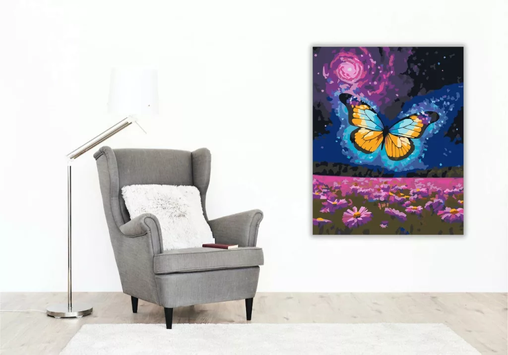 A képen egy pillangó repül egy ragyogó, virágokkal teli mező felett, háttérben csillagos, galaxisra emlékeztető égbolttal. A szárnyakon élénk kék és arany árnyalatok jelennek meg, felettük örvénylő fényfolttal. Mesés, álomszerű hangulatú kép, ami azonnal magára vonja a tekintetet. Ez a számfestő készlet tökéletes választás, ha egyedi dekorációval tennéd szebbé otthonodat, vagy ha különleges ajándékot keresel. A csomagban minden megtalálható, amire a festéshez szükséged van.