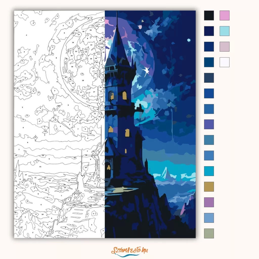 A képen egy magas, csúcsos torony látható a hatalmas telihold előtt. A sziklás hegyen kanyargó lépcsősor vezet fel a toronyhoz, az éjszakai égbolton csillagok és felhők jelennek meg. A mély kék és lila árnyalatok titokzatos, mesés hangulatot teremtenek. Ez a számfestő készlet tökéletes választás, ha egyedi dekorációval tennéd szebbé otthonodat, vagy ha különleges ajándékot keresel. A csomagban minden megtalálható, amire a festéshez szükséged van.