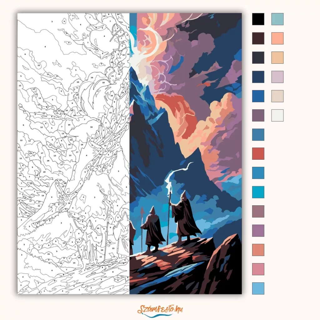 A képen négy köpenyes varázsló áll egy hegyoldalon, botjaikat az ég felé emelve, miközben a csúcs fölött villámok és örvénylő energiák találkoznak. A hegy kettéosztott ég alatt emelkedik, egyik oldalon hideg kék, a másikon izzó narancs fényekkel. A jelenet monumentális és feszültséggel teli, mintha egy hatalmas erő megszületésének pillanatát látnánk. Varázsolj egyedi hangulatot otthonodba ezzel a gyönyörű számfestő készlettel, amely tökéletes ajándék is lehet szeretteid számára. A csomag mindent tartalmaz, amire szükséged van ahhoz, hogy saját kezűleg alkoss egy lenyűgöző festményt.