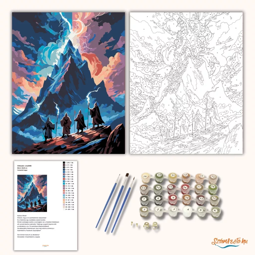 A képen négy köpenyes varázsló áll egy hegyoldalon, botjaikat az ég felé emelve, miközben a csúcs fölött villámok és örvénylő energiák találkoznak. A hegy kettéosztott ég alatt emelkedik, egyik oldalon hideg kék, a másikon izzó narancs fényekkel. A jelenet monumentális és feszültséggel teli, mintha egy hatalmas erő megszületésének pillanatát látnánk. Engedd szabadjára a kreativitásodat, és alkoss egy különleges műalkotást, amely otthonod dísze lehet de egyedi ajándékként is kiváló. A számfestő készletben minden szükséges eszközt megtalálsz a tökéletes végeredményhez.