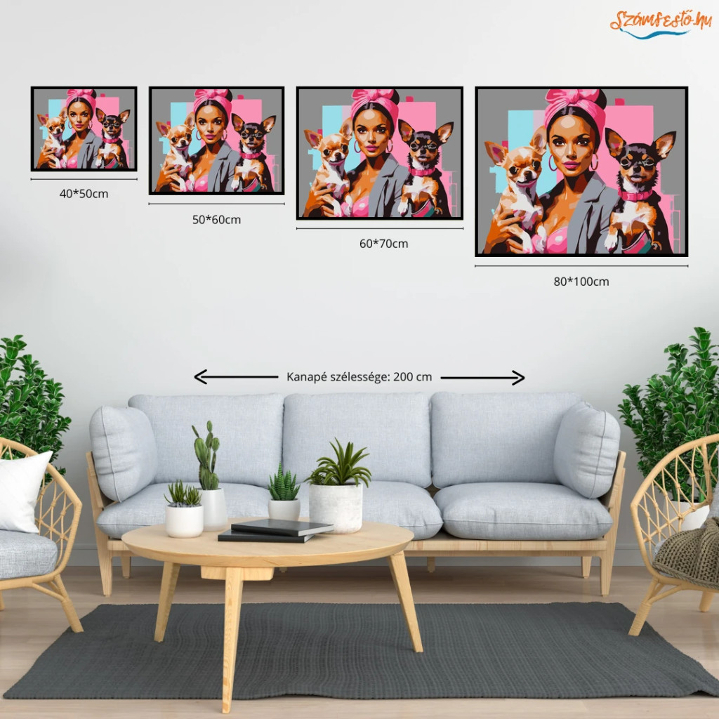 női portré, kutyák, csivava, masni, karika fülbevaló, rúzs, színes háttér