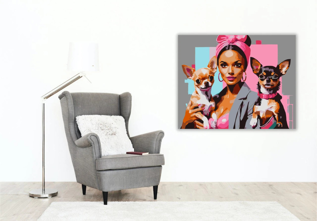A képen egy nő látható, aki két apró kutyát tart a kezében. A nő fején nagy masni van, fülében karika fülbevaló, és élénk rúzst visel. A háttérben nagy, színes blokkok és szürke felület adnak modern, vidám hangulatot.