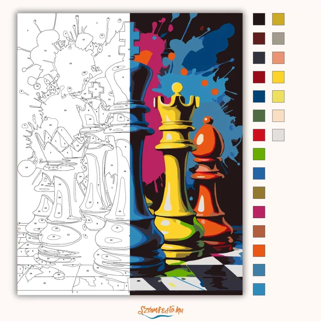 A képen színes sakkfigurák állnak egy sakktáblán, középen egy magas, kék királlyal. A háttérben nagy, fröccsent festékfoltok és cseppek láthatók, amelyek lendületes, játékos hangulatot adnak. Az élénk színek erős kontrasztot alkotnak a sötét háttérrel. Díszítsd otthonodat saját kézzel készített műalkotással, vagy ajándékozd meg szeretteidet egy igazán különleges élménnyel! A számfestő készletben minden szükséges eszköz megtalálható a festmény elkészítéséhez.