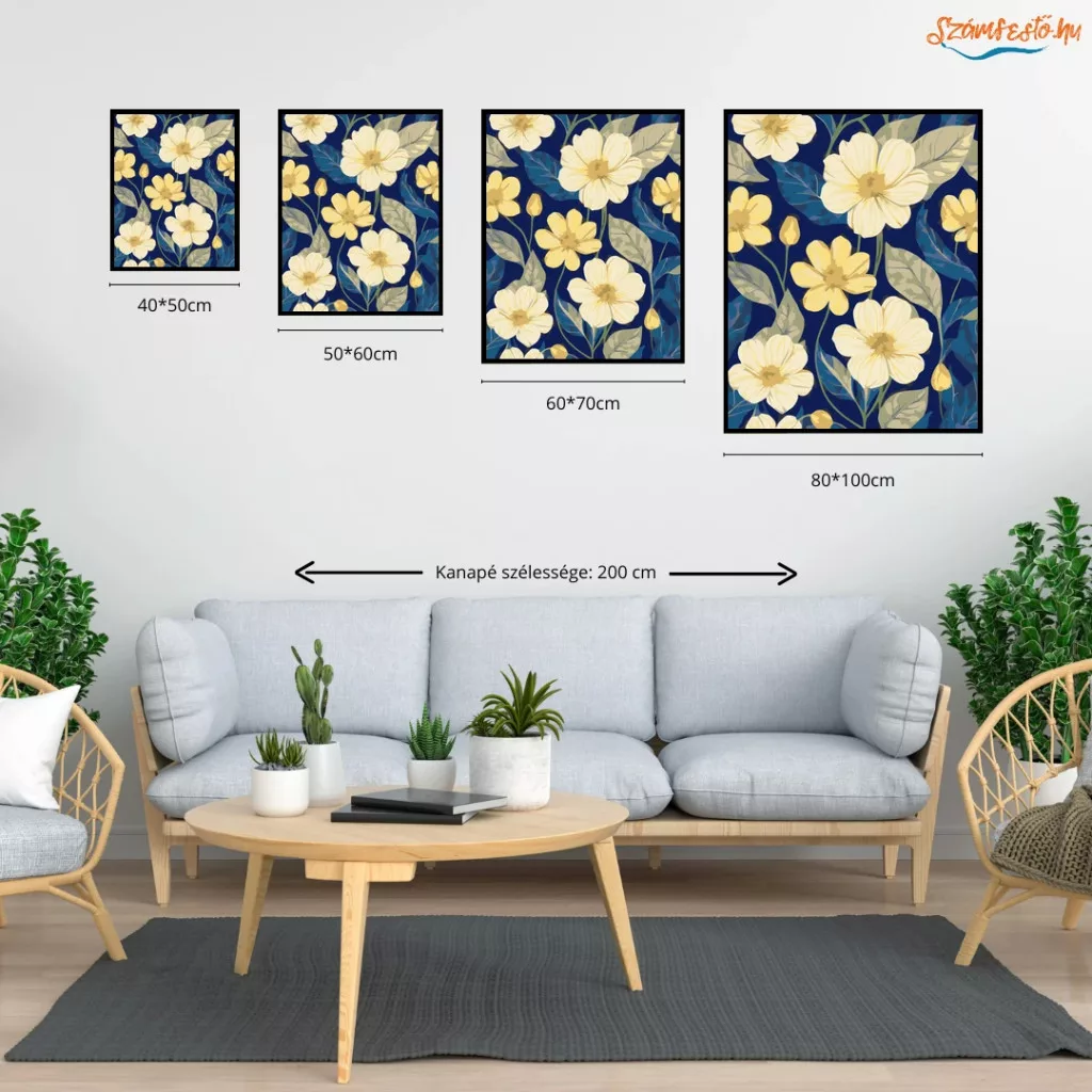 A képen nagy, világos sárga virágok láthatók sötétkék háttér előtt, körülöttük hullámos mintájú levelekkel és bimbókkal. A kontrasztos színek friss, vidám hangulatot adnak. Dekoratív, virágos látvány, ami feldobja a falat. Engedd szabadjára a kreativitásodat, és alkoss egy különleges műalkotást, amely otthonod dísze lehet de egyedi ajándékként is kiváló. A számfestő készletben minden szükséges eszközt megtalálsz a tökéletes végeredményhez.