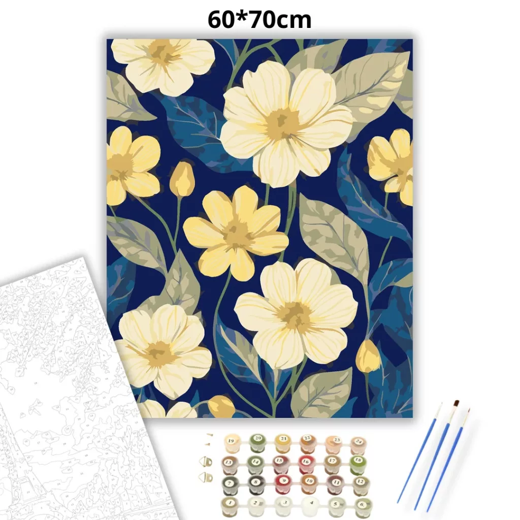 A képen nagy, világos sárga virágok láthatók sötétkék háttér előtt, körülöttük hullámos mintájú levelekkel és bimbókkal. A kontrasztos színek friss, vidám hangulatot adnak. Dekoratív, virágos látvány, ami feldobja a falat. Legyen a lakásod dísze vagy egy kedves meglepetés valaki számára – ez a számfestő készlet tökéletes választás mindkettőre. A készletben mindent megtalálsz, amivel lépésről lépésre megalkotható ez a gyönyörű festmény.