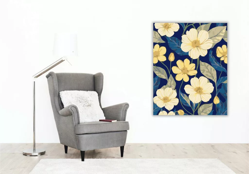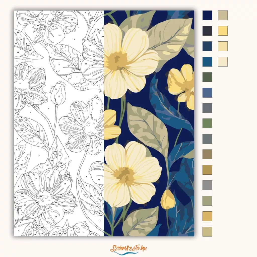 A képen nagy, világos sárga virágok láthatók sötétkék háttér előtt, körülöttük hullámos mintájú levelekkel és bimbókkal. A kontrasztos színek friss, vidám hangulatot adnak. Dekoratív, virágos látvány, ami feldobja a falat. Legyen a lakásod dísze vagy egy kedves meglepetés valaki számára – ez a számfestő készlet tökéletes választás mindkettőre. A készletben mindent megtalálsz, amivel lépésről lépésre megalkotható ez a gyönyörű festmény.