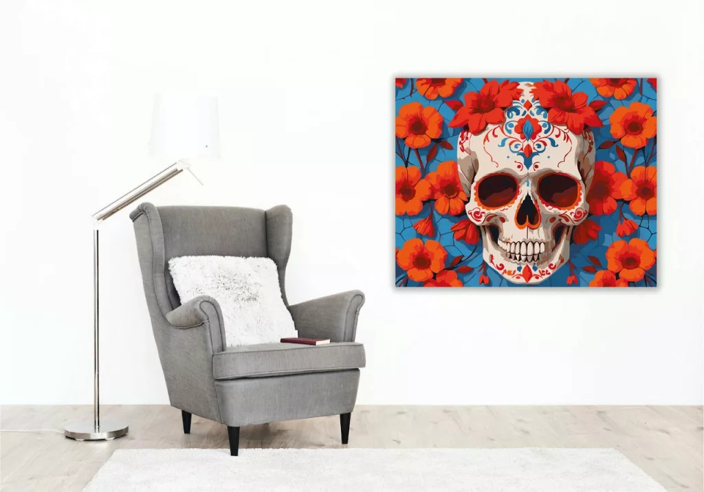A képen egy díszített koponya látható, piros és kék mintákkal az arcán. A koponyát nagy, élénk virágok és levelek veszik körül. Az összhatás erős, figyelemfelkeltő és dekoratív. Legyen a lakásod dísze vagy egy kedves meglepetés valaki számára – ez a számfestő készlet tökéletes választás mindkettőre. A készletben mindent megtalálsz, amivel lépésről lépésre megalkotható ez a gyönyörű festmény.