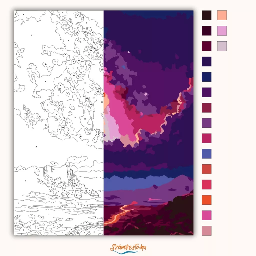 A képen egy hegyes, sziklás táj látható, a háttérben távoli dombokkal és egy kanyargó úttal. Fent hatalmas, gomolygó felhők uralják az eget, középen egy világos, fénylő sávval. A látvány egyszerre drámai és álomszerű, erős, kontrasztos színekkel. Ez a számfestő készlet tökéletes választás, ha egyedi dekorációval tennéd szebbé otthonodat, vagy ha különleges ajándékot keresel. A csomagban minden megtalálható, amire a festéshez szükséged van.