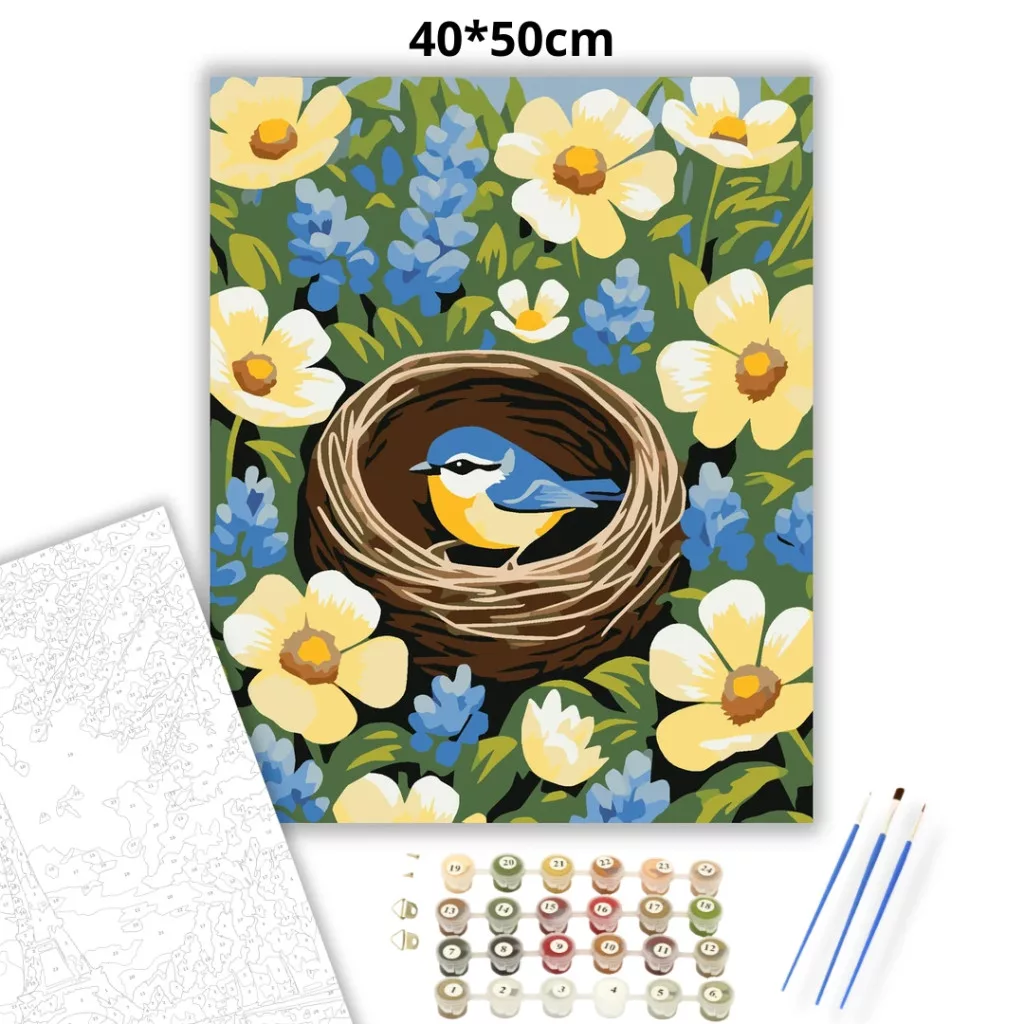 Virágok közt megbúvó fészek - számfestő készlet