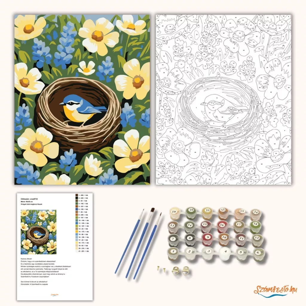 Egy apró madár ül egy fonott fészekben, amelyet sűrű, tavaszi virágzó bokor rejt. A nagy, világos virágok és a kék fürtös virágok friss, üde hangulatot adnak a képnek. A zöld levelek között megbújó fészek meghitt, természetközeli látvány. Varázsolj egyedi hangulatot otthonodba ezzel a gyönyörű számfestő készlettel, amely tökéletes ajándék is lehet szeretteid számára. A csomag mindent tartalmaz, amire szükséged van ahhoz, hogy saját kezűleg alkoss egy lenyűgöző festményt.