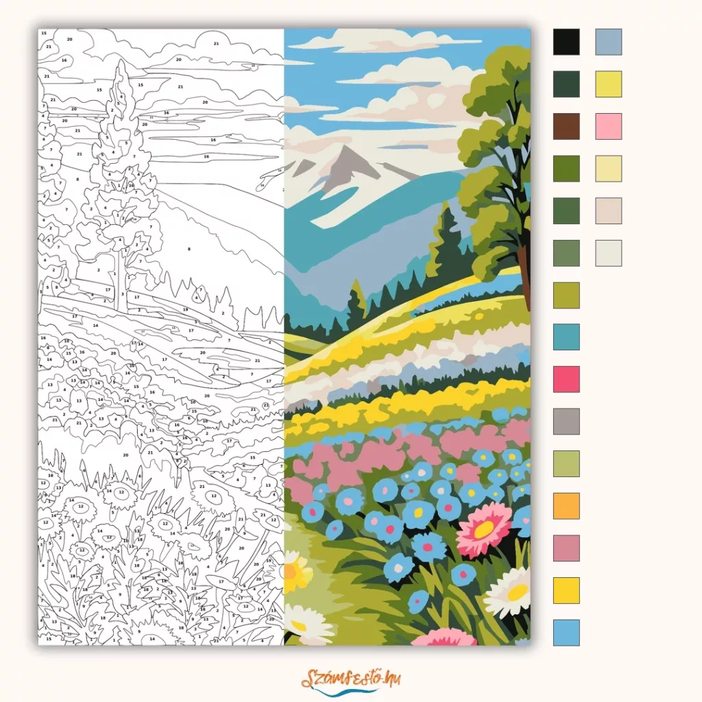 A képen tavaszi hegyvidéki táj látható, távolban havas hegycsúccsal és felhős, derűs éggel. Az előtérben színes vadvirágos rét és kanyargó ösvény vezet a dombok között. Friss, üde hangulatú kép, sok zölddel és élénk virágszínekkel. Legyen a lakásod dísze vagy egy kedves meglepetés valaki számára – ez a számfestő készlet tökéletes választás mindkettőre. A készletben mindent megtalálsz, amivel lépésről lépésre megalkotható ez a gyönyörű festmény.