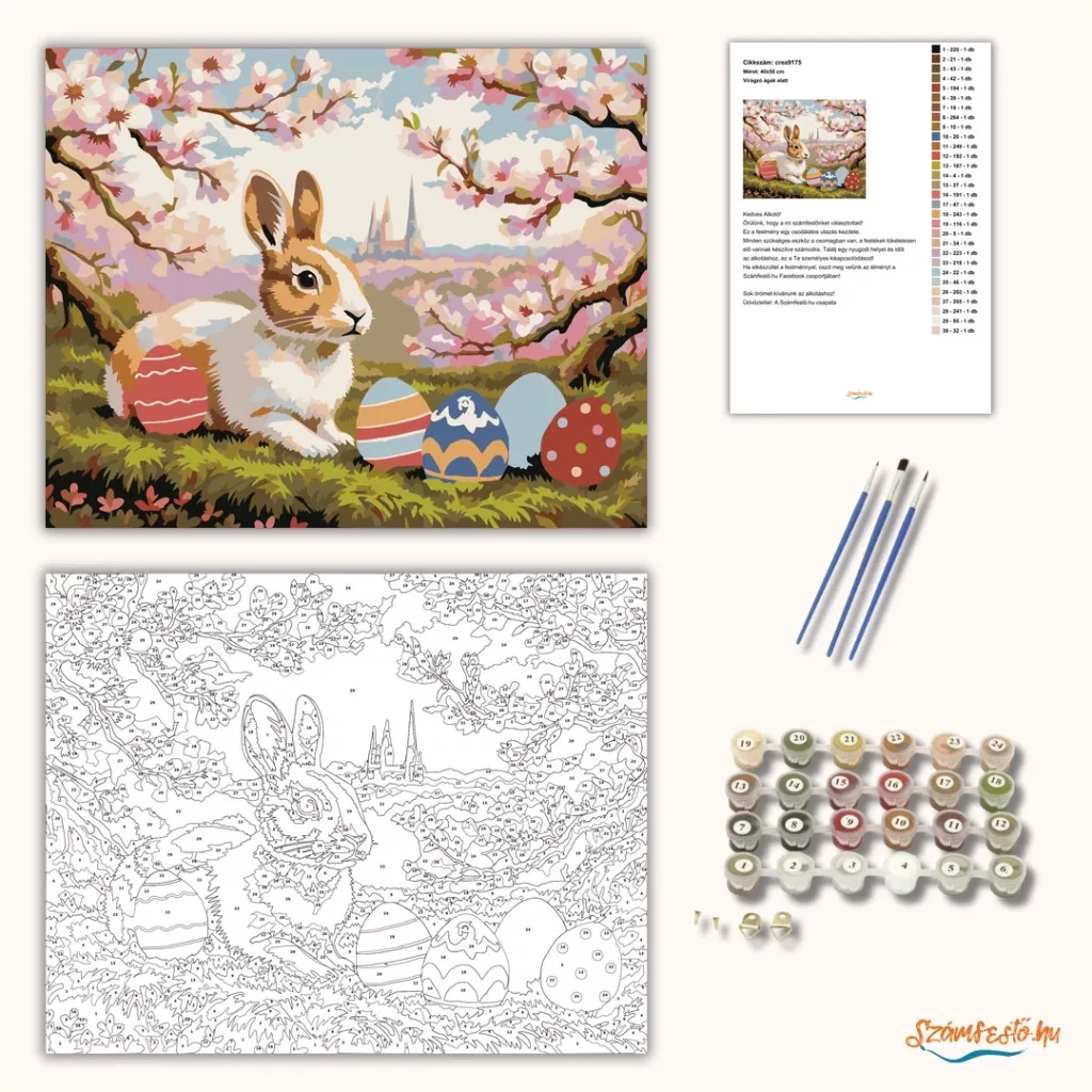 A képen egy kis nyúl látható a virágzó fák alatt, a fűben ülve, mellette díszített húsvéti tojásokkal. A távolban egy város tornyai rajzolódnak ki, a háttér pedig tavaszi, álomszerű tájba olvad. A pasztelles, lágy színek kedves és nyugodt hangulatot teremtenek. Engedd szabadjára a kreativitásodat, és alkoss egy különleges műalkotást, amely otthonod dísze lehet de egyedi ajándékként is kiváló. A számfestő készletben minden szükséges eszközt megtalálsz a tökéletes végeredményhez.