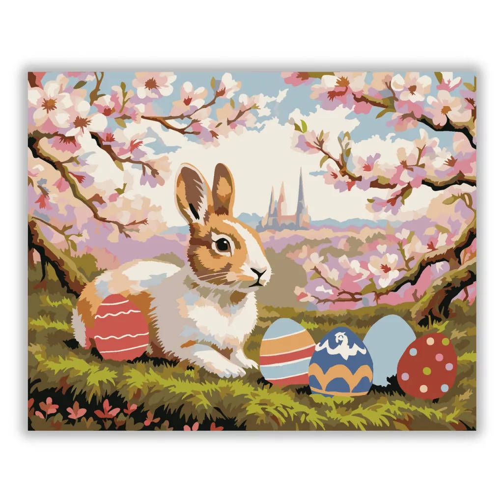 A képen egy kis nyúl látható a virágzó fák alatt, a fűben ülve, mellette díszített húsvéti tojásokkal. A távolban egy város tornyai rajzolódnak ki, a háttér pedig tavaszi, álomszerű tájba olvad. A pasztelles, lágy színek kedves és nyugodt hangulatot teremtenek. Legyen a lakásod dísze vagy egy kedves meglepetés valaki számára – ez a számfestő készlet tökéletes választás mindkettőre. A készletben mindent megtalálsz, amivel lépésről lépésre megalkotható ez a gyönyörű festmény.