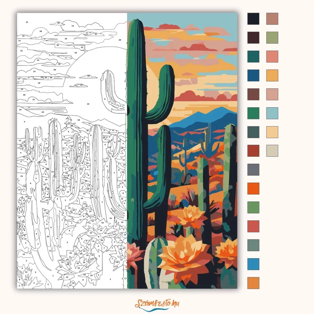 A képen hatalmas kaktuszok emelkednek a sivatagi táj fölé, a háttérben hegyekkel és egy nagy, alacsonyan álló nappal. A felhős ég és a meleg fényű naplemente nyugodt, mégis energikus hangulatot ad a jelenetnek. Elöl virágzó kaktuszok teszik még látványosabbá a tájat. Engedd szabadjára a kreativitásodat, és alkoss egy különleges műalkotást, amely otthonod dísze lehet de egyedi ajándékként is kiváló. A számfestő készletben minden szükséges eszközt megtalálsz a tökéletes végeredményhez.