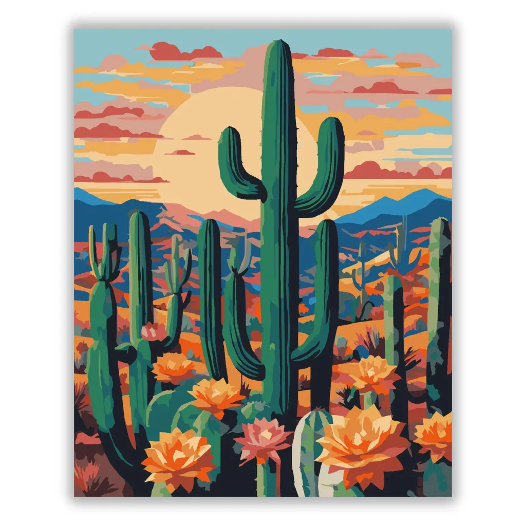 A képen hatalmas kaktuszok emelkednek a sivatagi táj fölé, a háttérben hegyekkel és egy nagy, alacsonyan álló nappal. A felhős ég és a meleg fényű naplemente nyugodt, mégis energikus hangulatot ad a jelenetnek. Elöl virágzó kaktuszok teszik még látványosabbá a tájat. Varázsolj egyedi hangulatot otthonodba ezzel a gyönyörű számfestő készlettel, amely tökéletes ajándék is lehet szeretteid számára. A csomag mindent tartalmaz, amire szükséged van ahhoz, hogy saját kezűleg alkoss egy lenyűgöző festményt.