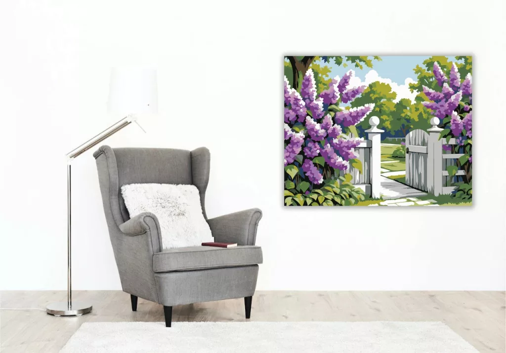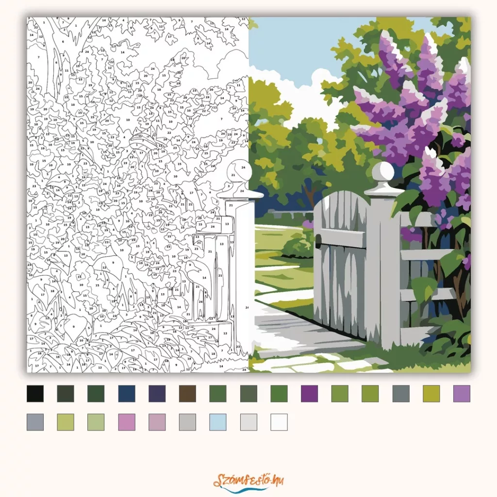 A képen tavaszi orgonabokrok láthatók teljes virágzásban egy fehér kerti kapu mellett. A kapun túl napfényes kert és kanyargó ösvény hívogat a zöld fák felé. A lila és fehér virágok friss, romantikus hangulatot adnak a jelenetnek. Legyen a lakásod dísze vagy egy kedves meglepetés valaki számára – ez a számfestő készlet tökéletes választás mindkettőre. A készletben mindent megtalálsz, amivel lépésről lépésre megalkotható ez a gyönyörű festmény.