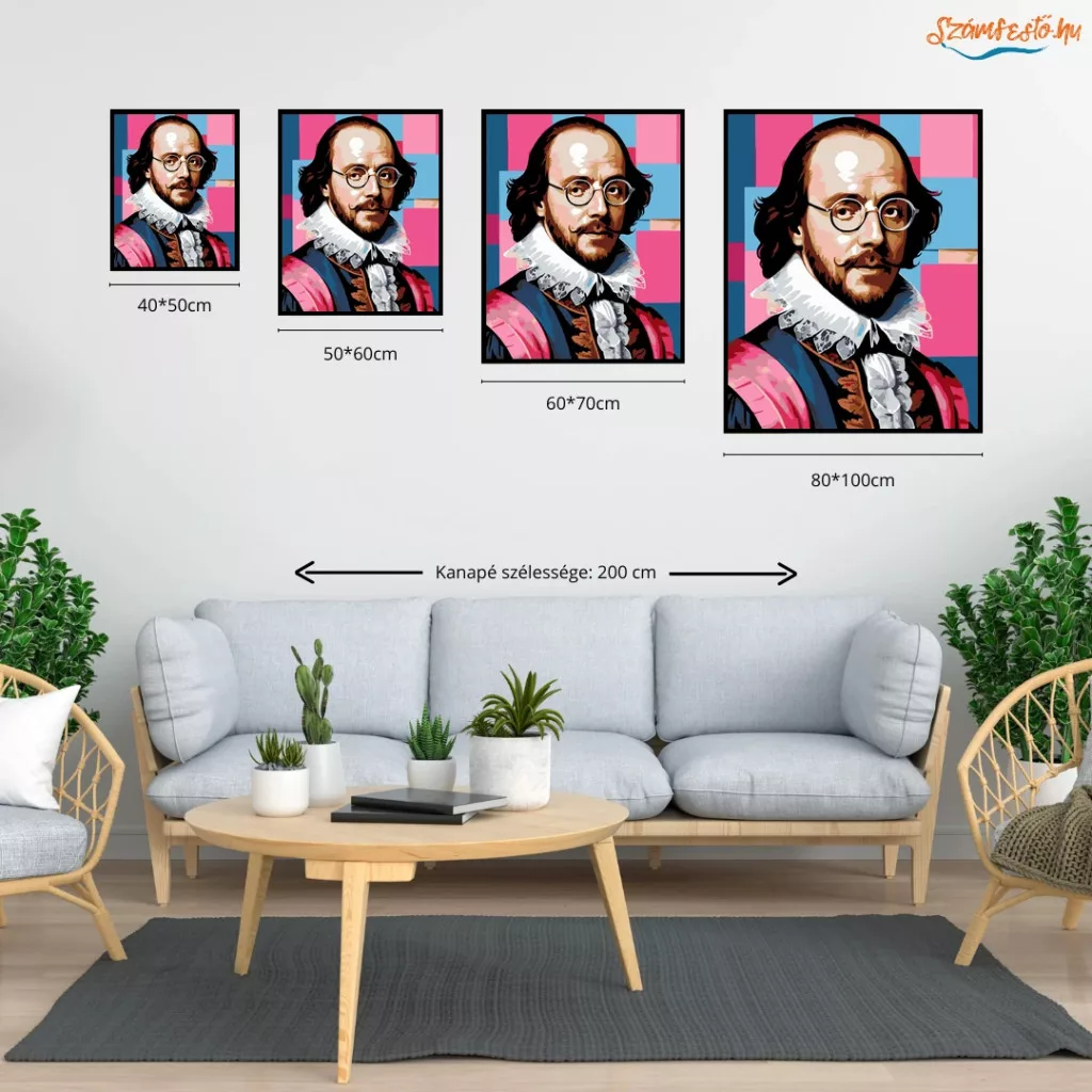 A képen William Shakespeare portréja látható kerek szemüvegben, bajusszal és szakállal. A nyakán fodros gallér van, a háttérben pedig élénk, négyzetes mintázat jelenik meg. A kép merész, vidám hangulatú, erős kontrasztokkal. Díszítsd otthonodat saját kézzel készített műalkotással, vagy ajándékozd meg szeretteidet egy igazán különleges élménnyel! A számfestő készletben minden szükséges eszköz megtalálható a festmény elkészítéséhez.