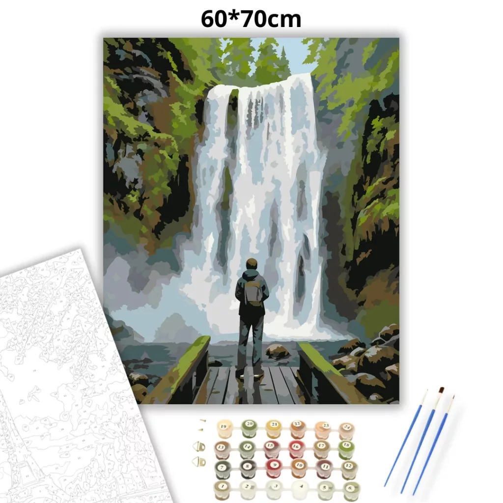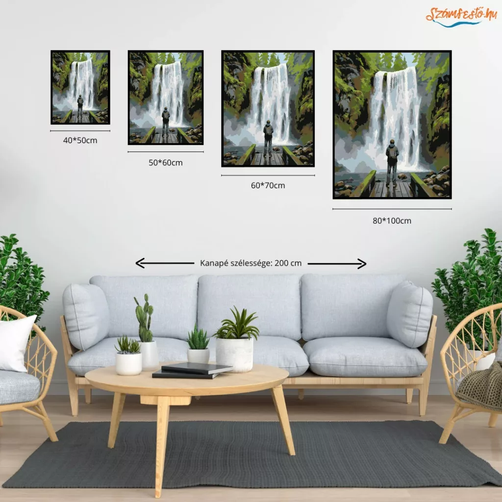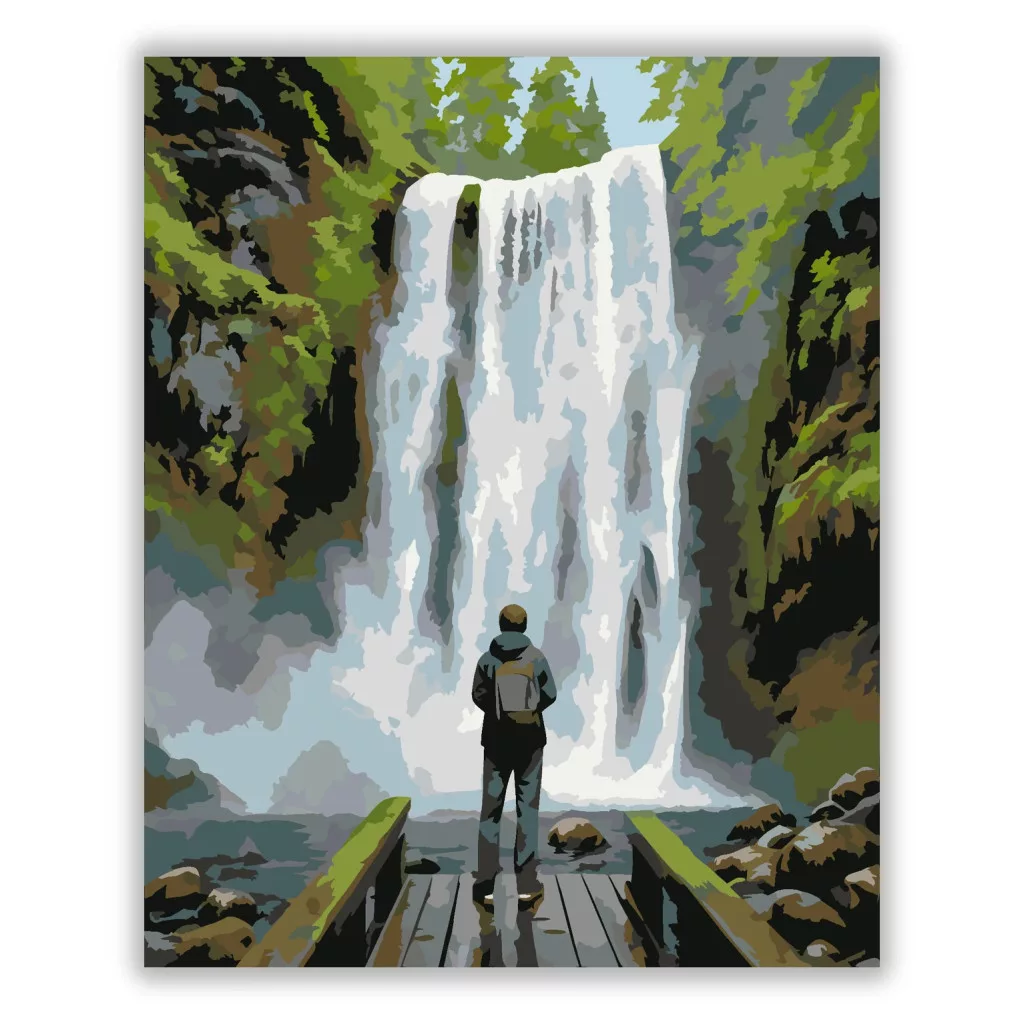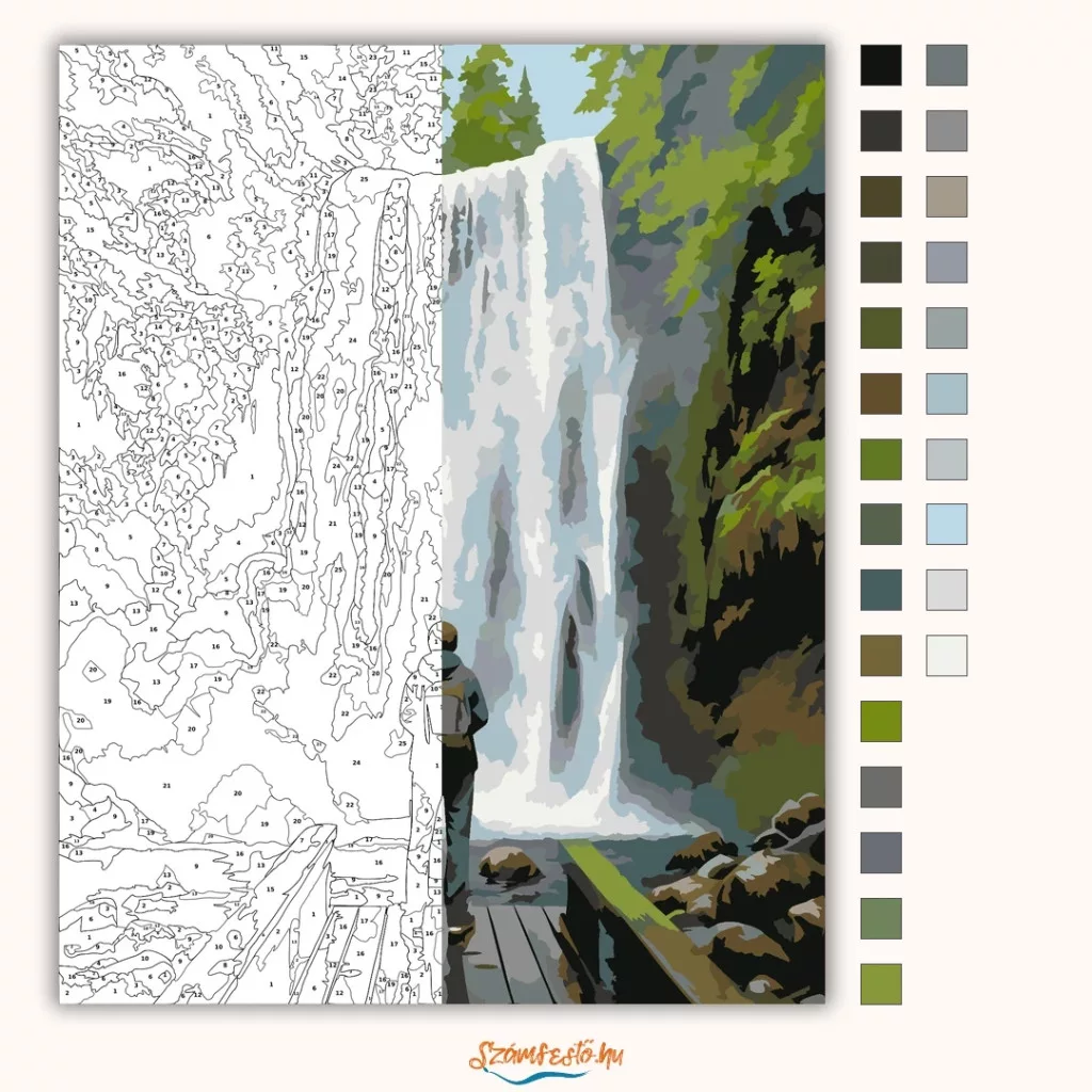 A képen egy hatalmas vízesés zúdul alá egy sziklás, erdős szurdokban, előtte egy ember áll egy fából készült pallón és a látványt nézi. A lezúduló víz és a párás környezet friss, természetközeli hangulatot ad. A zöld lombkorona és a szürke sziklák szépen keretezik a vízesés erejét. Ez a számfestő készlet tökéletes választás, ha egyedi dekorációval tennéd szebbé otthonodat, vagy ha különleges ajándékot keresel. A csomagban minden megtalálható, amire a festéshez szükséged van.